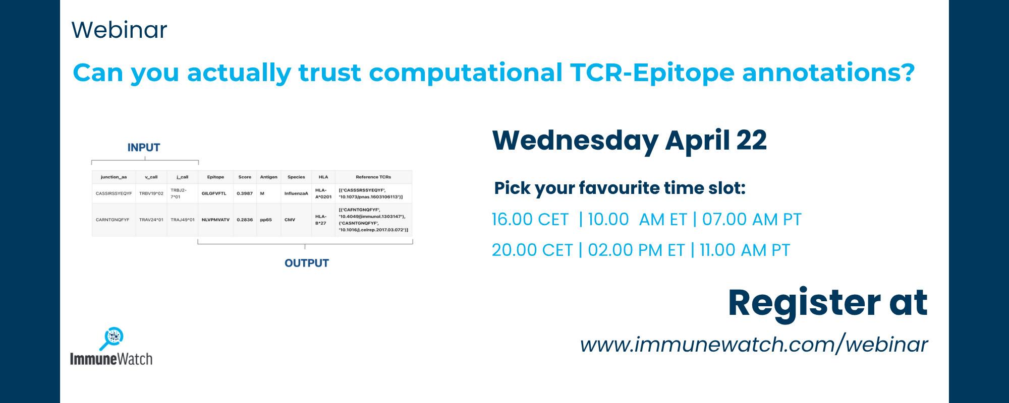 Going from a TCR sequence to its putative target is not an easy task. We found relief switching to ImmuneWatch DETECT. Now we can just say; here's an award-winning algorithm that people rely, trust, and this is what we are using.